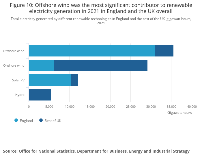 Figure 10: Offshore wind was the most significant contributor to renewable electricity generation in 2021 in England and the UK overall