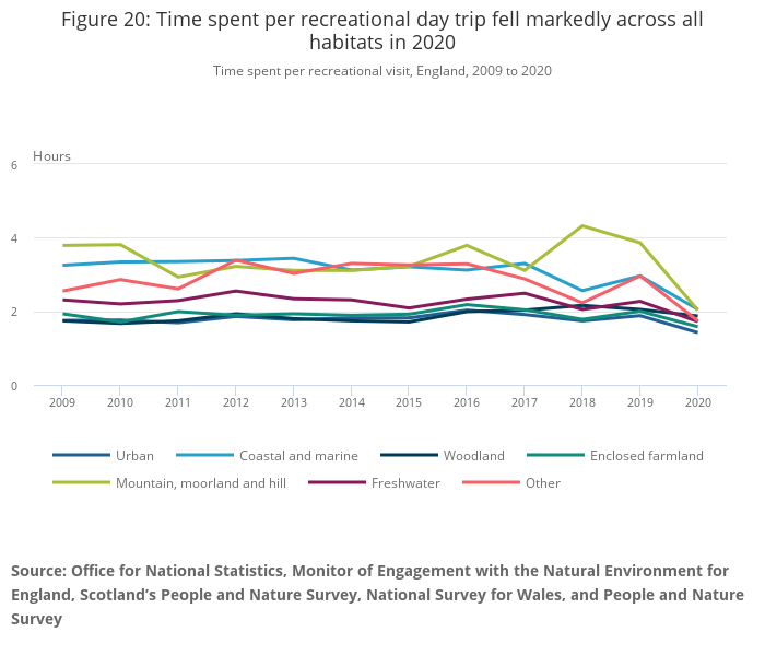 Download this chart Figure 20: Time spent per recreational day trip fell markedly across all habitats in 2020