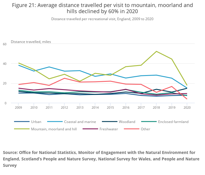 Figure 21: Average distance travelled per visit to mountain, moorland and hills declined by 60% in 2020