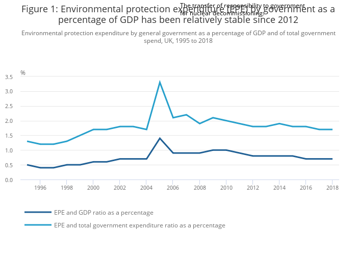 Government spending on environmental protection as a percentage of total government expenditure was unchanged between 2017 and 2018. It has remained relatively stable since 2000, ranging from 1.7% to 2.2%. The exception to this was in 2005 when the transfer of responsibility to government for nuclear decommissioning took place1.