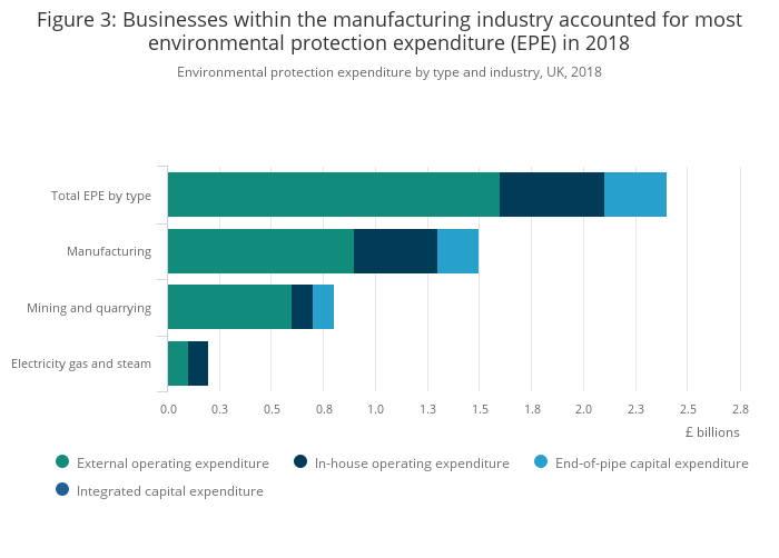 Businesses in the manufacturing industry spent £1.5 billion on environmental protection, accounting for almost two-thirds of the total EPE by UK businesses in 2018.