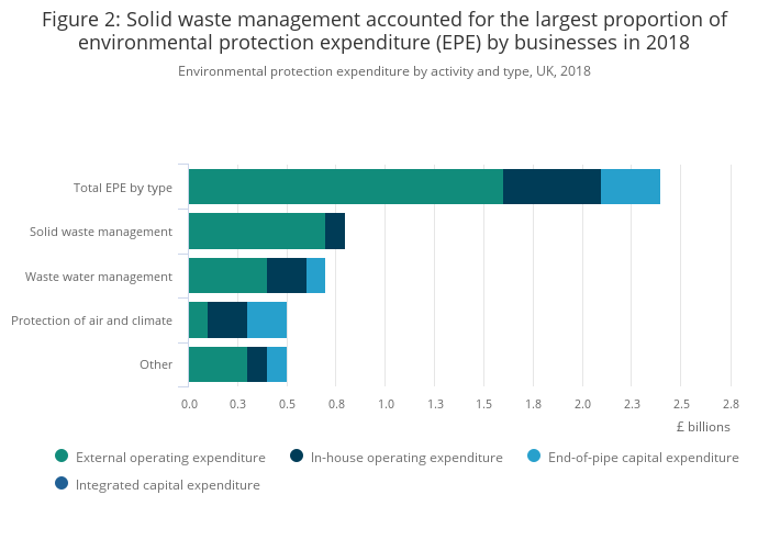 Business expenditure on solid waste management activities (£0.9 billion) accounted for the largest proportion (35%) of all environmental protection expenditure (EPE) in 2018. Solid waste management activities include the treatment, disposal and investigation of waste, including general waste such as paper and cardboard, as well as hazardous and non-hazardous waste.