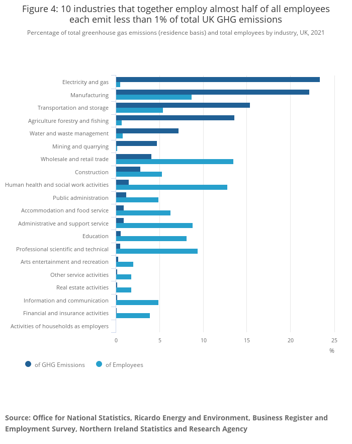 Nearly half (47%) of UK employees worked in 1 of 10 industries that accounted for less than 1% of total UK greenhouse gas (GHG) emissions in 2021.