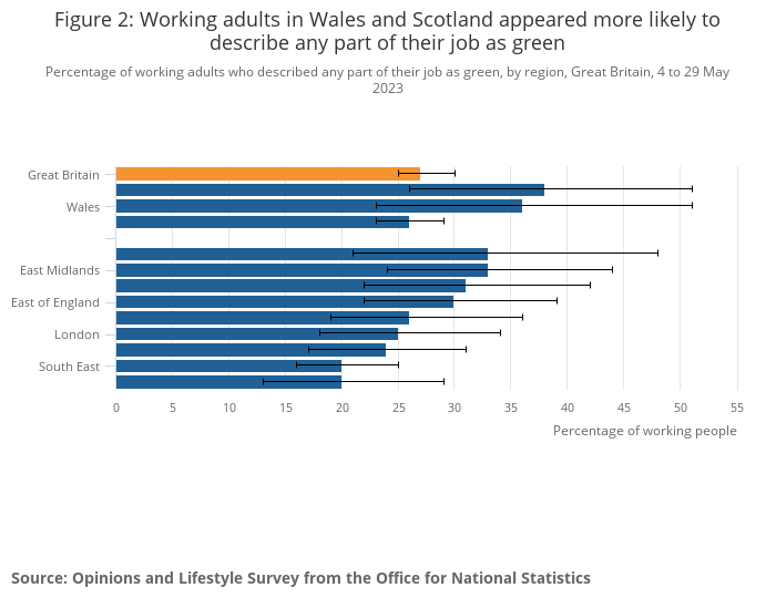 Working adults in Scotland (38%) and Wales (36%) appeared more likely to describe any part of their job as green than those in England (26%).