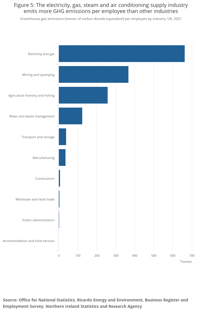 Greenhouse gas emissions (tonnes of carbon dioxide equivalent) per employee by industry, UK, 2021