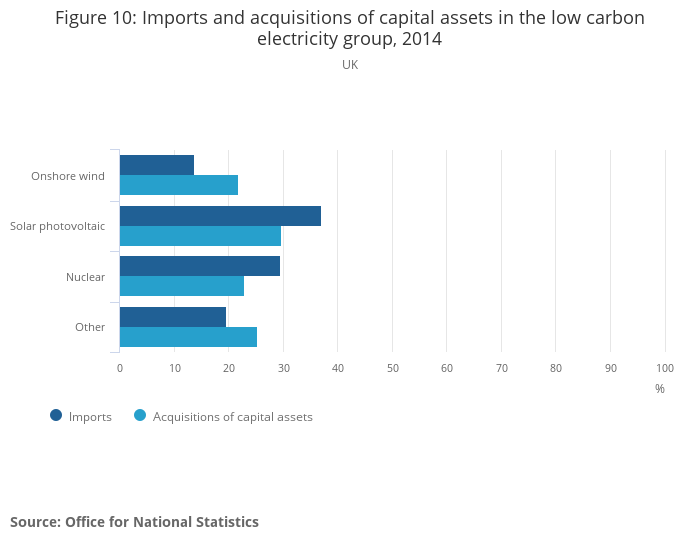 | 5. Total UK non-financial business economy imports and exports are derived from UK Balance of Payments, The Pink Book, 2015. To ensure a like-for-like comparison, data by industry are required to remove those industries that are not selected for the Low Carbon and Renewable Energy Economy Survey. UK imports and exports figures are not available by industry and therefore an exact comparison is not possible. However, figures are available for financial imports and exports. As financial industries are excluded from the Low Carbon and Renewable Energy Economy Survey sample, these have been excluded from calculations, which will improve comparability. | ||