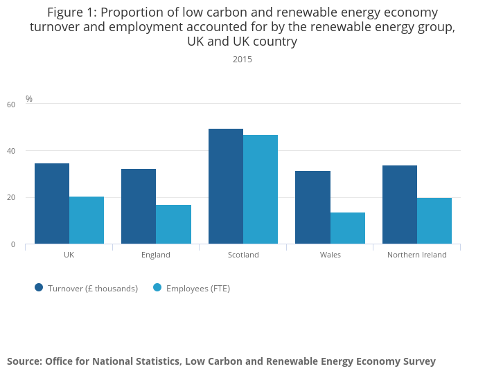 In 2015, the low carbon and renewable energy economy resulted in the employment of 187,000 full-time equivalent (FTE) employees in England, 79.9% of all LCRE employees. Employment in LCRE activities in England accounted for 0.9% of the total non-financial employees in England while the LCRE employment in Scotland accounted for 1.6% of the total non-financial employees in Scotland. In 2015, there were 11,000 FTE employees engaged in LCRE activities in Wales (1.2% of total non-financial employees in Wales) and an estimated 5,000 FTE employees in Northern Ireland (1.2% of total non-financial employees in Northern Ireland).