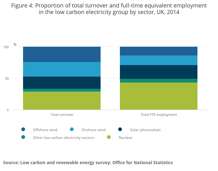 Download this chart Figure 4: Proportion of total turnover and full-time equivalent employment in the low carbon electricity group by sector, UK, 2014