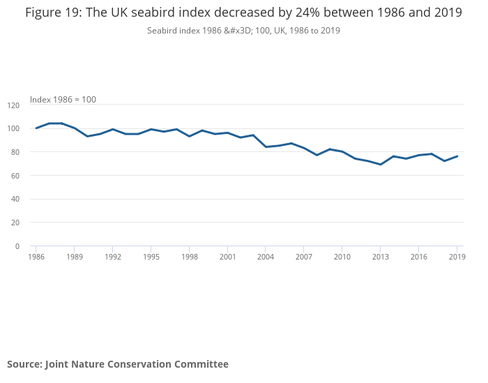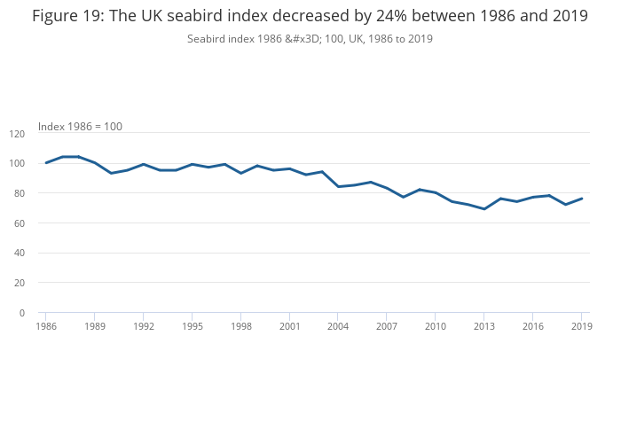 Species indicators in decline include those for butterflies, falling to an all-time low in 2012, and moths, in long-term decline from 1996. Woodland birds saw their greatest decline in the early 1980s to the early 1990s, driven by woodland specialist decline in willow tits, tree pipits, spotted flycatchers and lesser redpolls (PDF, 4.85MB).