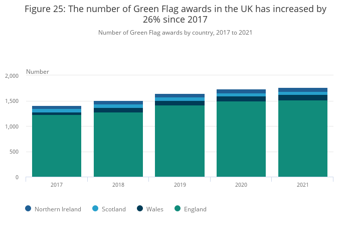 The Green Flag Award (PDF, 3.0MB) is a scheme that recognises and rewards well-managed parks and green spaces, a standard for the management of UK recreational outdoor spaces. The number of Green Flag awards has increased 26%, from 1,404 in 2017 to 1,765 in 2021.