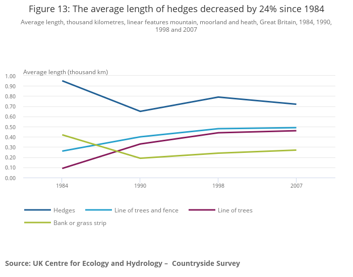 Enclosed farmland covered 13,426,415 hectares of land area in the UK in 1990; by 2019 this area had decreased by around 5% to 12,694,693 hectares. Over the same period, urban areas increased from 1,418,964 hectares by around 30% to 1,843,901 hectares. Woodland habitats grew by 29%, from 2,540,272 hectares in 1990 to 3,268,707 hectares in 2019.