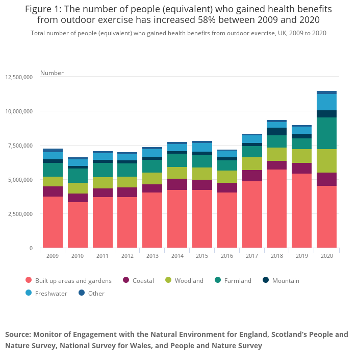 Figure 1: The number of people (equivalent) who gained health benefits from outdoor exercise has increased 58% between 2009 and 2020