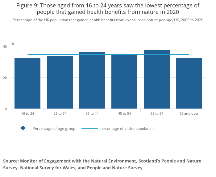 Figure 9: Those aged from 16 to 24 years saw the lowest percentage of people that gained health benefits from nature in 2020