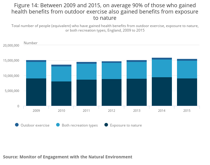 In 2019, the number of people (equivalent) who gained health benefits from outdoor exercise within the UK was estimated to be 9.0 million, compared with 21.1 million who gained benefits from exposure to nature. A larger number of people spent 120 minutes or more in nature each week, compared with exercising for 30 minutes, five times a week.