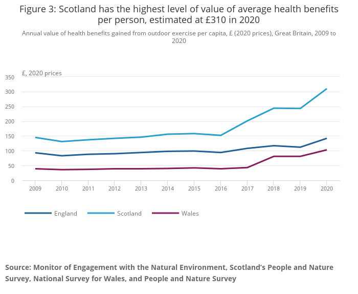 If we focus only on those who gained benefits from outdoor exercise rather than the entire population, the national comparisons differ slightly. In 2020 the estimated value of the benefits gained per person who exercised was £760 in Wales, £720 in England, and £790 in Scotland.