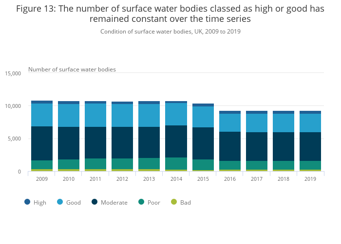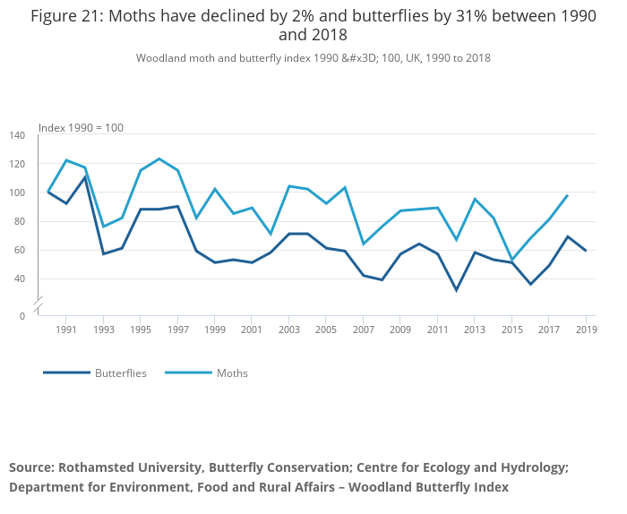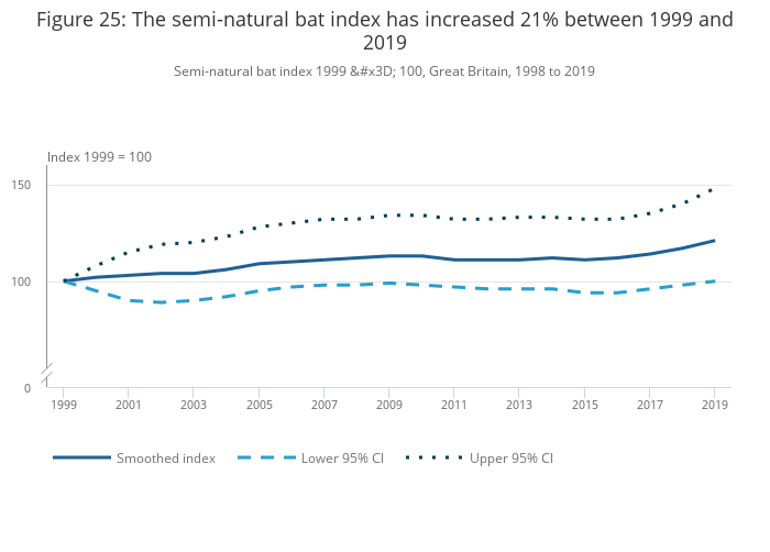 The bird indices on population numbers for woodland and water and wetlands plus butterflies of woodland and semi-natural habitats are in long term decline, with a negative impact on biodiversity. While there has also been a decline in the average numbers of bees counted in the last decade in semi-natural habitats, in the same period the average number of bats counted has increased.