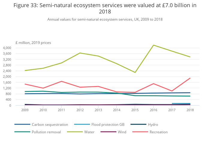 The asset account includes selected semi-natural habitats ecosystem services, valued at £270 billion in 2018 (Table 24). See methodology publication for full details.