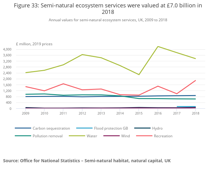 The annual value of services from the UK's semi-natural habitats is estimated at £7.0 billion in 2018.