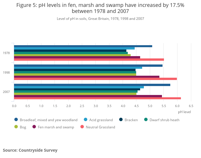 Physical state | Soil | pH | Reduction in acidity all habitats 1978 to 2007 | Improving | Improving |