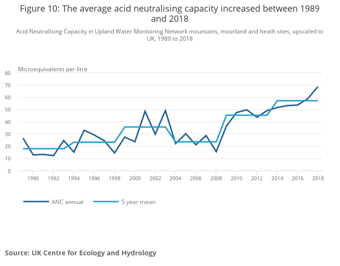 Uplands water | Acid Neutralising capacity | Increasing ability to neutralise acid deposition1989 to 2018 | Improving | Improving | |