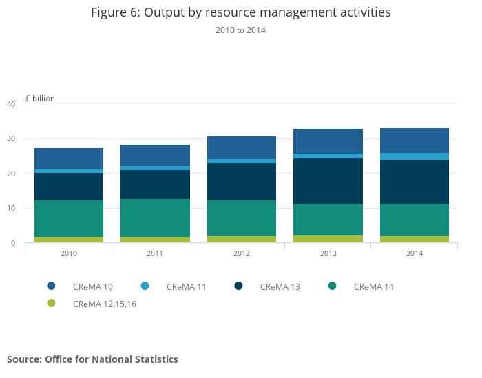 Output of resource management activities has increased more rapidly than environmental protection activities due mainly to the growth in the management of energy resources (CReMA 13), which includes the production of renewable energy activities. The slow in growth between 2013 and 2014 observed in the CReMA activities is primarily a result of the 5 ABS-derived EGSS activities (see “Section 9: Quality and methodology” for more information), around two-thirds of which feed in to various CReMA activities. The main area of growth observed in the environmental protection activities was in waste management (CEPA 3) with a 25.3% increase in output from £11.6 billion in 2010 to £14.6 billion in 2014.