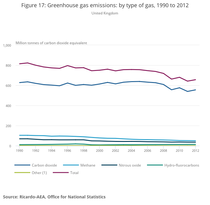 Greenhouse gas emissions have generally decreased since the mid-1990s, falling from a peak of 822.9 million tonnes of CO2 equivalent (CO2e) in 1991 to 642.0 million tonnes of CO2e in 2011, the lowest point in the series. In 2012, greenhouse gas emissions increased by 2.2% to 656.3 million tonnes of CO2e
