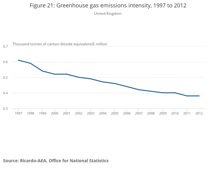 Greenhouse gas emissions intensity was 37.7% lower in 2012 (0.38 thousand tonnes of CO2e per £ million) compared with 1997 (0.61 thousand tonnes of CO2e per £ million)