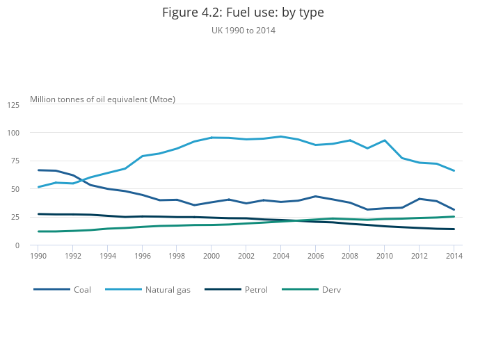 Coal use has decreased by 52.9% since 1990, with 66.3 Mtoe used in 1990 compared with 31.2 Mtoe in 2014. The largest annual increase in coal use was 24.0% between 2011 and 2012 (from 32.9 Mtoe to 40.8 Mtoe), partly because of a switch in the electricity generation sector from natural gas towards cheaper coal. However, between 2013 and 2014 coal use fell 19.5% (from 38.8 Mtoe to 31.2 Mtoe), the largest annual decrease. This decrease was mainly due to a fall in power stations’ consumption.