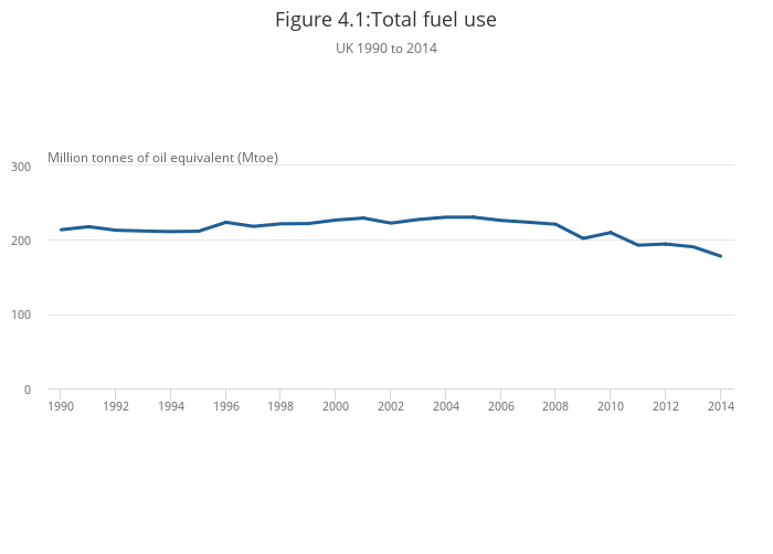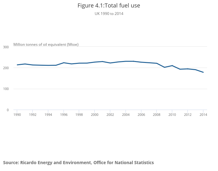 Fuel use has decreased by 16.6% since 1990, falling from 213.6 million tonnes of oil equivalent (Mtoe) to 178.1 Mtoe in 2014 – the lowest point since 1990.