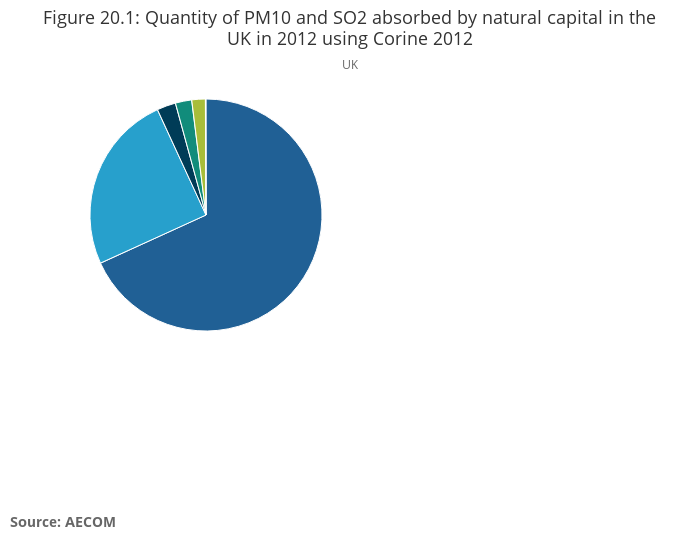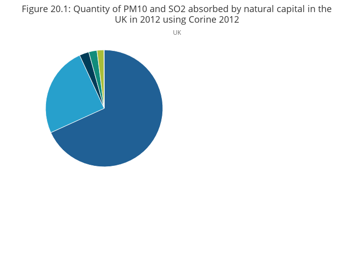 Research commissioned by ONS has estimated the amounts of PM10 absorbed by woodland in the UK, based on the CORINE Land Cover inventory for 2012. These estimates have been used to generate estimates of the amounts absorbed for the years 2004 to 2014, based on the changes in woodland reported by the Forestry Commission and the change in absorption levels per hectare of woodland between 2006 and 2012 as estimated by the ONS study.