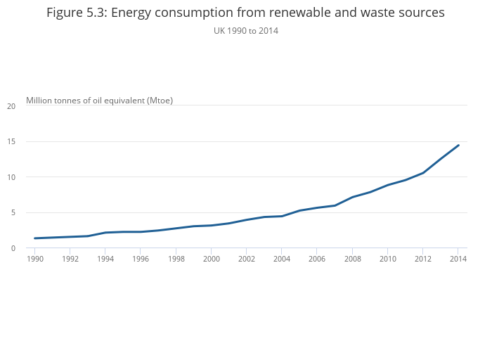 Energy consumption from renewable and waste sources has been increasing since 1990; reaching a record high of 14.4 million tonnes of oil equivalent in 2014. These sources contributed 7.1% of total energy consumption.