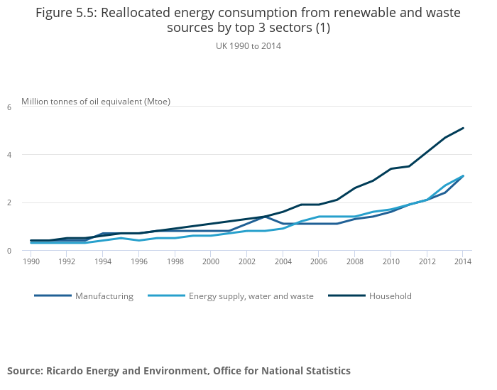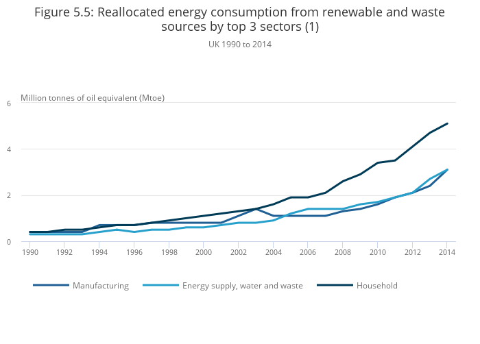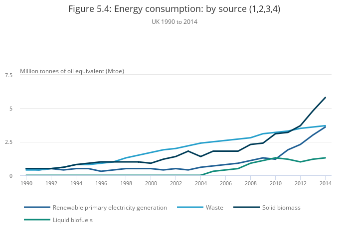 In 2014, 14.4 Mtoes of energy was consumed from renewable and waste sources, contributing to a record high of 7.1% of total energy consumption (Figure 5.3). This was 10.7 times greater than in 1990, where only 1.3 Mtoes of energy was consumed from renewable and waste sources. Between 2013 and 2014, energy consumption from renewable and waste sources increased by 15.1%, from 12.5 Mtoe to 14.4 Mtoe. This rise is primarily due to an increase in power stations’ combustion of wood.