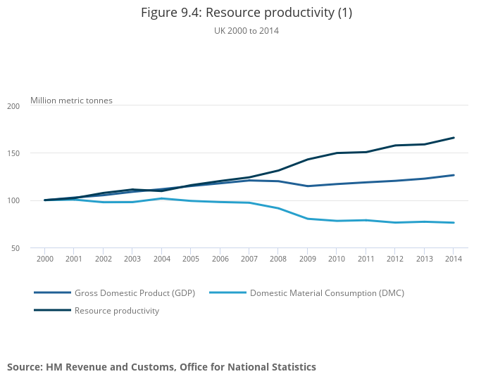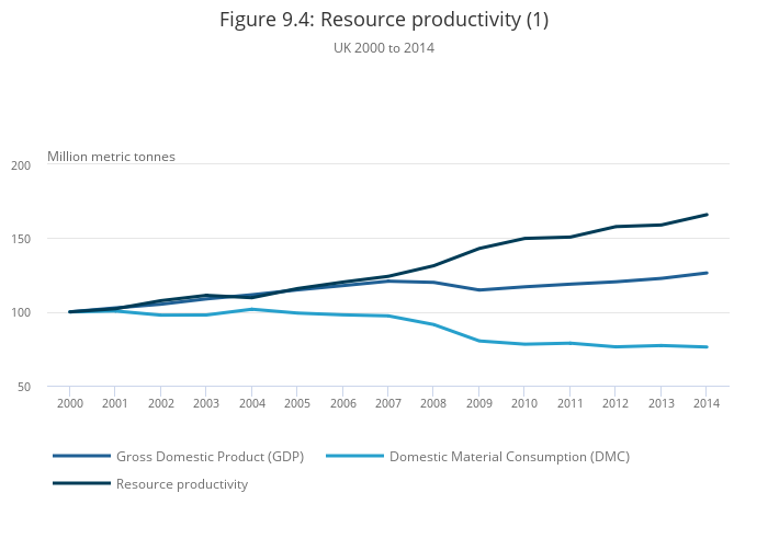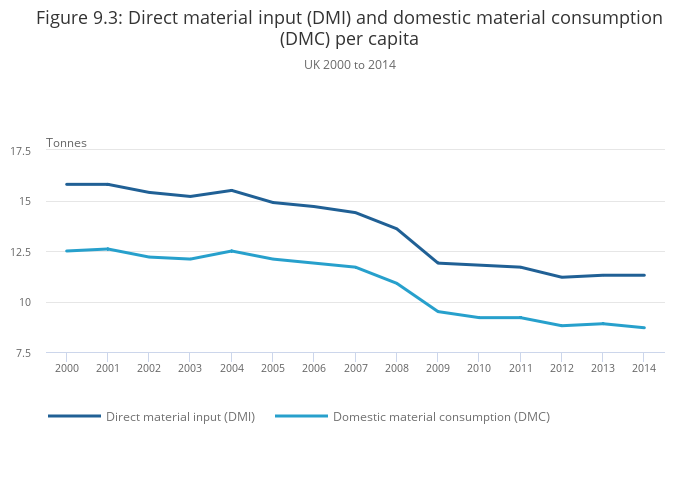 The amount of material resources consumed (per person) has decreased by 30.4% between 2000 and 2014, falling from 12.5 tonnes per person to 8.7 tonnes per person.