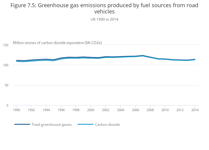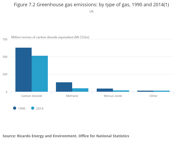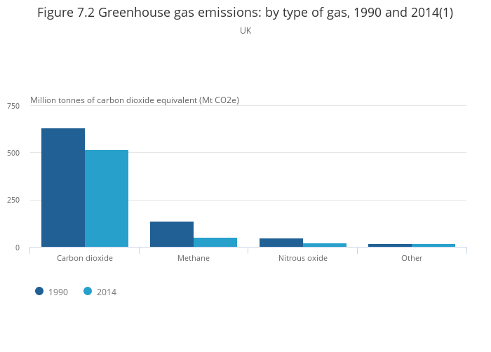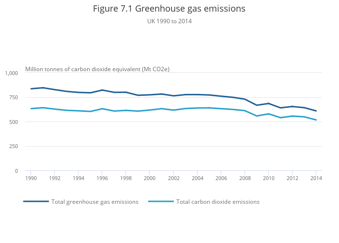 Emissions of greenhouse gases have decreased since 1990; peaking in 1991 at 845.2 million tonnes of carbon dioxide equivalent and falling to 608.6 million tonnes of carbon dioxide equivalent in 2014. This is the lowest level since 1990.