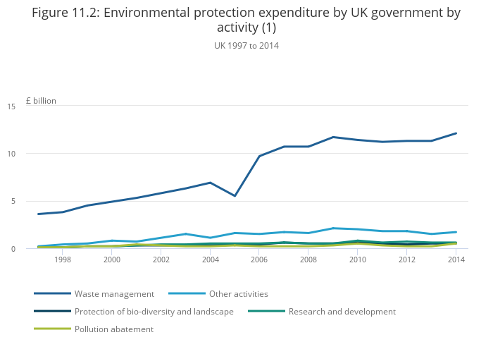 Since 1997, UK government spend on environmental protection expenditure (EPE) has increased from £4.1 billion to £15.4 billion in 2014, and currently accounts for 1.9% of total government spending.