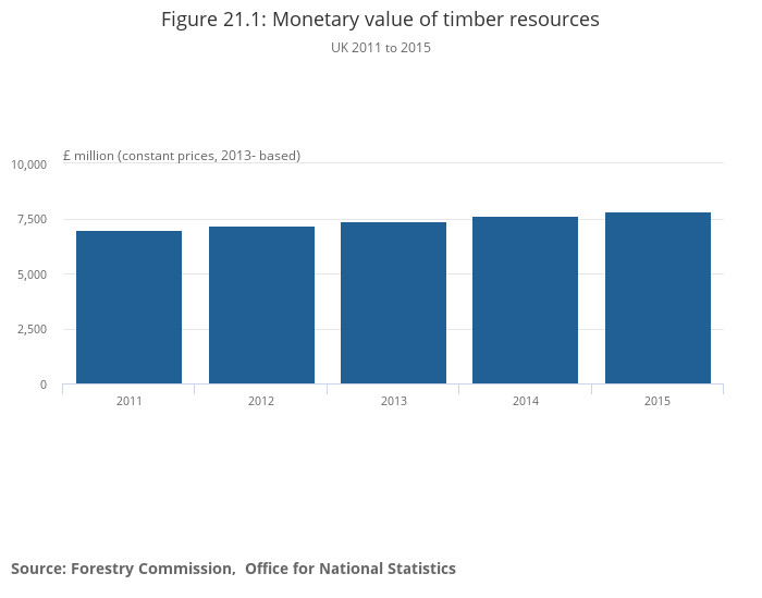 A partial and experimental estimate of the total value of woodland ecosystems in the UK is £168 billion in 2014, based on the net present value of the expected future flows of the 4 main services (timber, carbon sequestration, air filtration and recreation) over a 50 year period, using the social discount rate10.