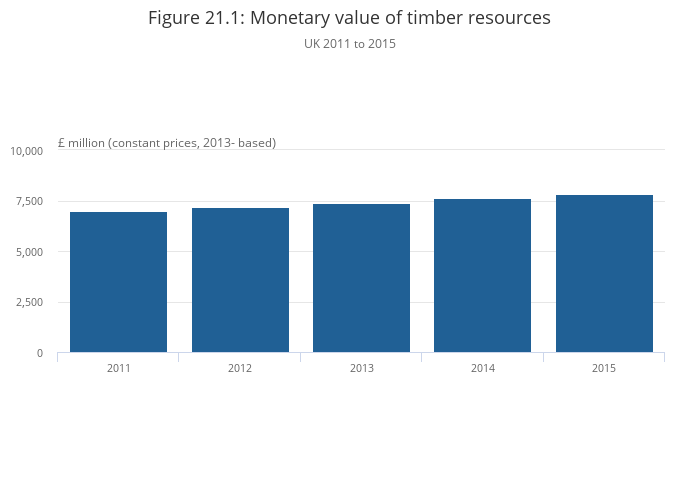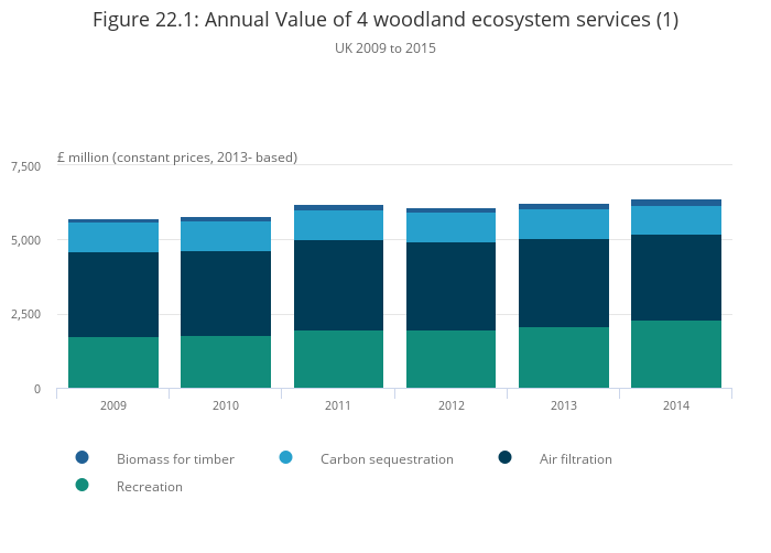 A partial and experimental estimate of the total value of woodland ecosystems in the UK is £168 billion in 2014, based on the net present value of the expected future flows of the 4 main services (timber, carbon sequestration, air filtration and recreation) over a 50 year period, using the social discount rate10.
