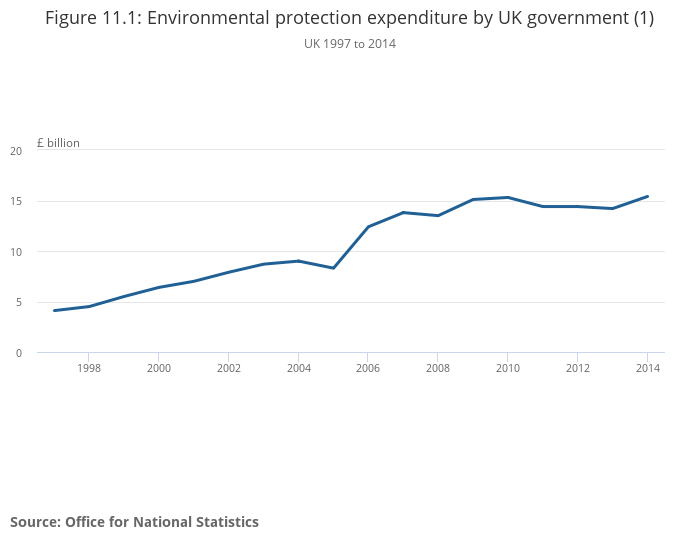 Since 1997, UK government spend on environmental protection expenditure (EPE) has increased from £4.1 billion to £15.4 billion in 2014, and currently accounts for 1.9% of total government spending.