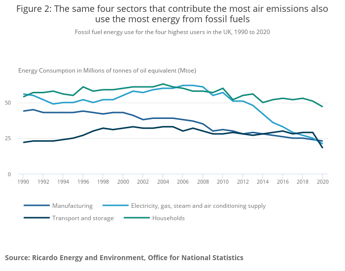 Households and the energy, manufacturing, and transport sectors are the biggest users of energy from fossil fuels. In 2020, these sectors accounted for 82% of all fossil fuel energy use in the UK. These are the same four sectors that accounted for the most GHG emissions in 2020.
