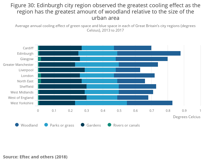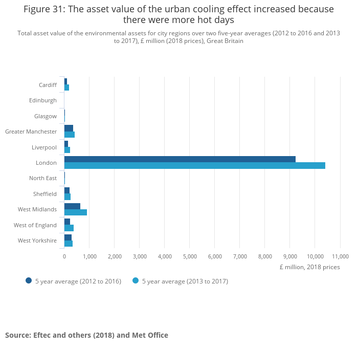 - The cooling shade of trees and water saved the UK £248 million by maintaining productivity and lowering air conditioning costs on hot days in 2017.