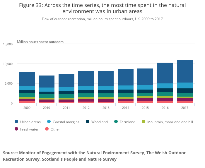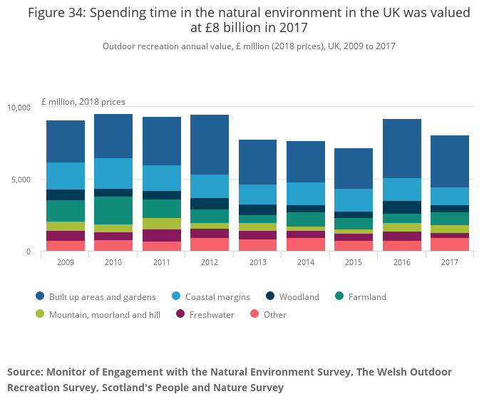 - In 2016, living within 500 metres of green and blue space was estimated to be worth £78 billion to UK homes.