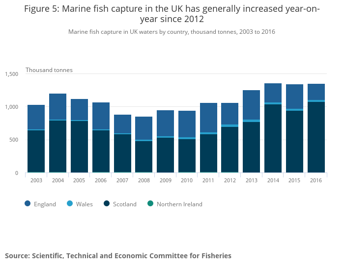 Marine fish capture in UK waters has increased nearly a third since 2003 from 1,032 thousand tonnes to 1,349 thousand tonnes in 2016.