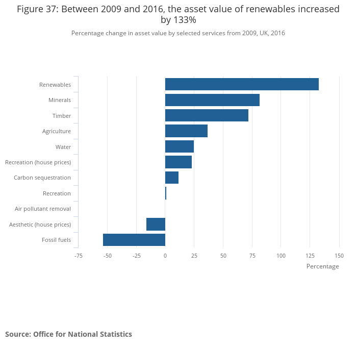 Figure 37 presents the percentage change in UK natural capital asset values between 2009 to 2016 by selected services. Between the years 2009 and 2016, the asset value of renewables increased by 133%. That is, the asset value for renewable energy more than doubled during this period. In contrast, the asset value of fossil fuels has more than halved in this time period.