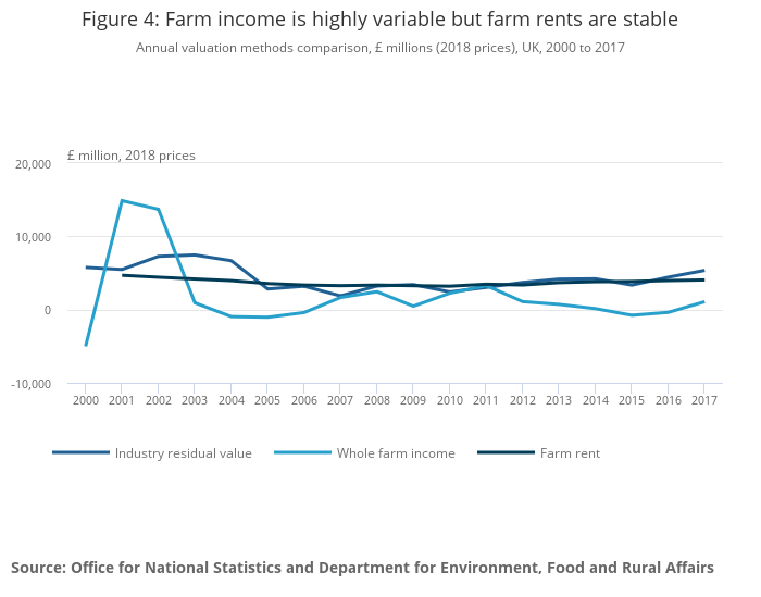 Image .csv .xlsThe spike in whole farm income between 2001 and 2002 was the result of a significant drop in farming costs. The average costs for agriculture per farm fell from £137,000 to £47,000, returning to typical levels in 2003 (£147,000). This spike is not reflected in farm rents or the industry residual value. We are unsure of the specific drivers of this fluctuation but for context, 2001 was the year a foot and mouth disease outbreak occurred in Great Britain.