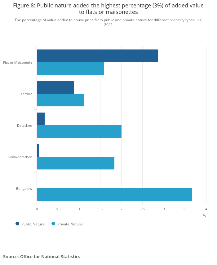 In 2021, publicly accessible green space (for example, public parks), added greatest value (3%) to flats or maisonettes compared with other property types, whereas private nature (for example, private gardens) added the greatest value (4%) to bungalows.