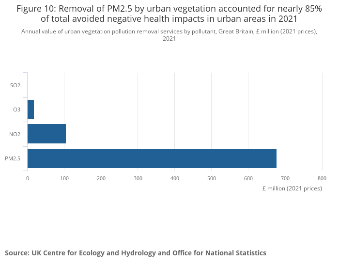 The annual value of air pollution removal services by urban vegetation was around £800 million in 2021.