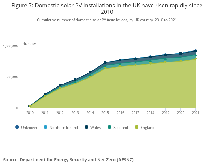 The Department for Energy Security and Net Zero supplied data for the number of small scale solar photovoltaic installations and capacity at residential properties. The assumption is that the majority of residential properties will be in urban areas, but this will not always be the case.