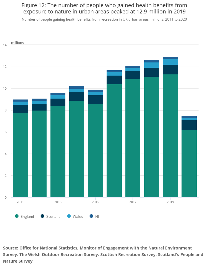Figure 12: The number of people who gained health benefits from exposure to nature in urban areas peaked at 12.9 million in 2019