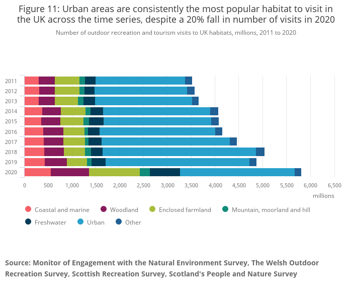There were an estimated 2.4 billion recreation and tourism visits to UK urban areas in 2020, an increase of 28% from 2011 (1.9 billion). These include visits to places such as urban parks and gardens. This represents 41% of all outdoor recreation and tourism visits in the UK in 2020, making it the most popular habitat to visit (Figure 11).