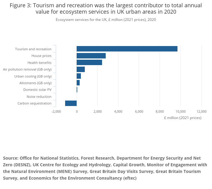 The total annual value of ecosystem services in UK urban areas was around £15 billion in 2020, of which tourism and recreation accounted for £10 billion.